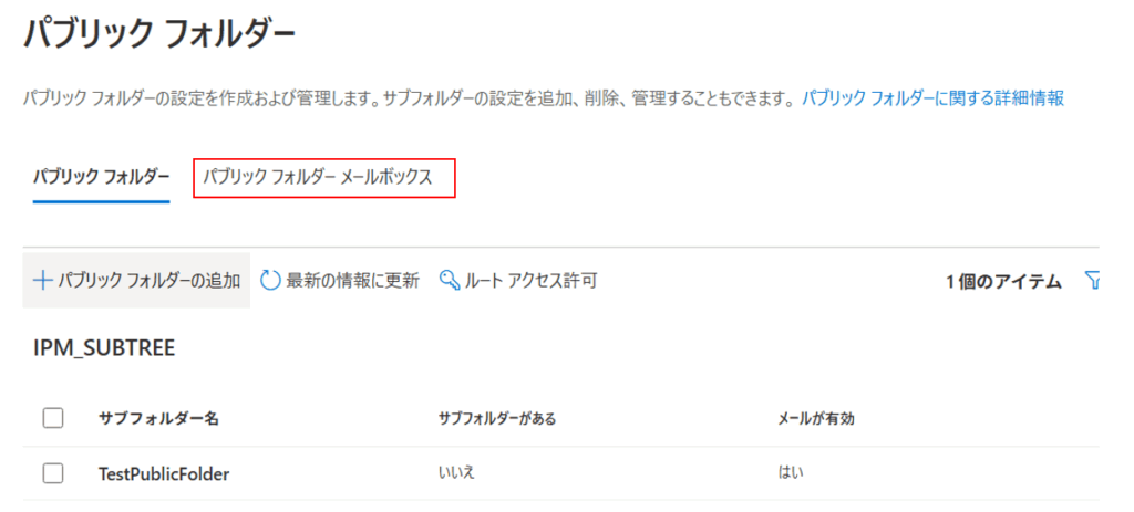 パブリックフォルダーメールボックスは、パブリックフォルダを作成するためのストレージ領域と理解するとよいと思います。