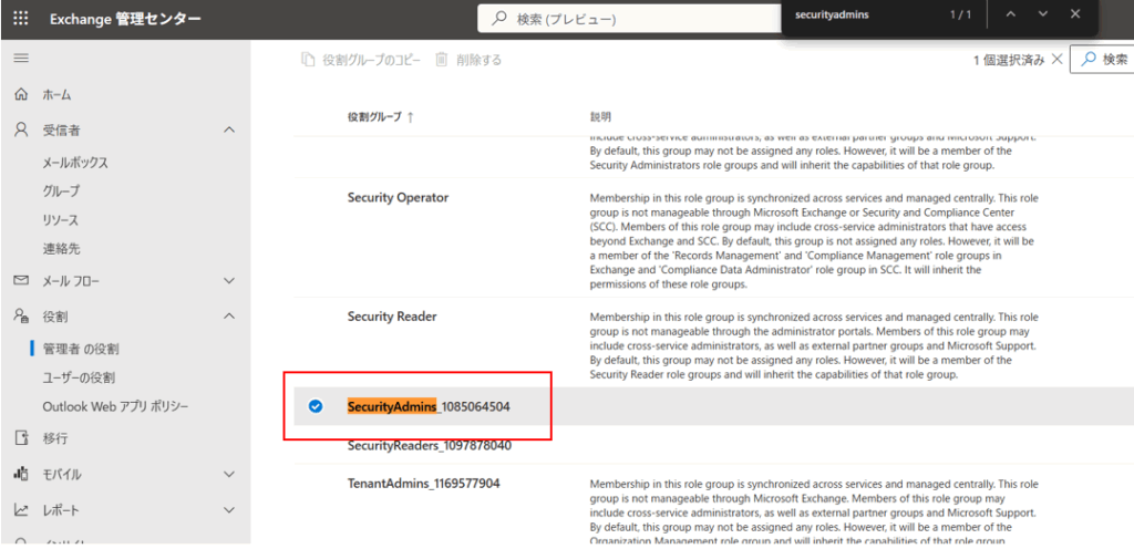 例として、Entra ID の “セキュリティ管理者" にユーザーを割り当てるなどにより、Exchange 管理センター側に " SecurityAdmins_123456789″(数字はランダム) という役割グループが生成され、Exchange 管理センターの役割である Security Administrator に、当該 “SecurityAdmins_123456789" という役割グループがメンバーとして追加されます。