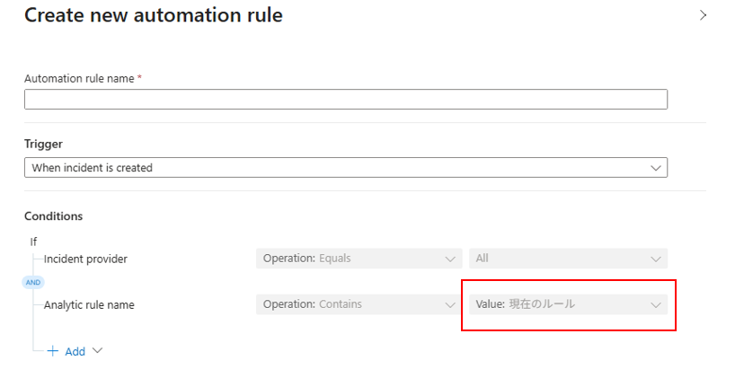「+新規追加」で設定を進めると以下の赤枠のように、オートメーションルールが実行される際の条件として、「Analytic rule name(分析ルール名)の欄に「現在のルール」という値が自動で設定されます。