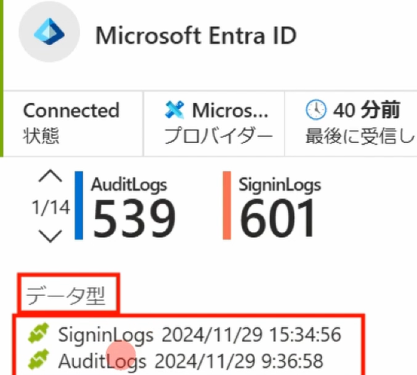 対象のデータコネクタをクリックすると画面の右側に画面が表示されます。その中の「データ型」の項目に、そのデータコネクタによって取り込まれるログテーブル名が表示されています。