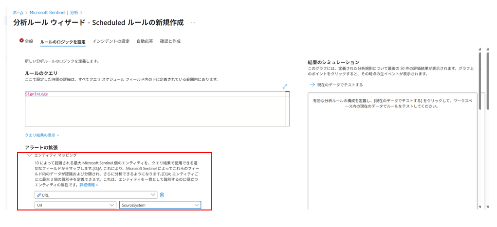 分析ルールのクエリによって出力される結果のどの列を、エンティティとして扱うか指定できます。