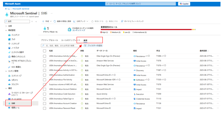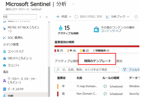 ちなみに、コンテンツハブでインストールされた分析ルールは、「分析」画面の「規則のテンプレート」タブに追加され、ここで利用できます。
