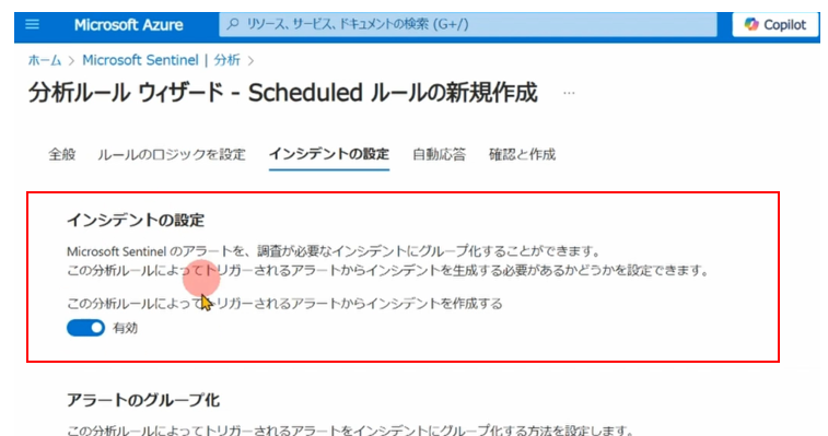 分析ルールに合致するとアラートが生成されます。そのアラートによってインシデントまで作成してしまうのかこちらで設定可能です(インシデントとは、そもそも一つ以上のアラートが含まれる概念です)