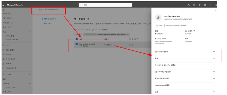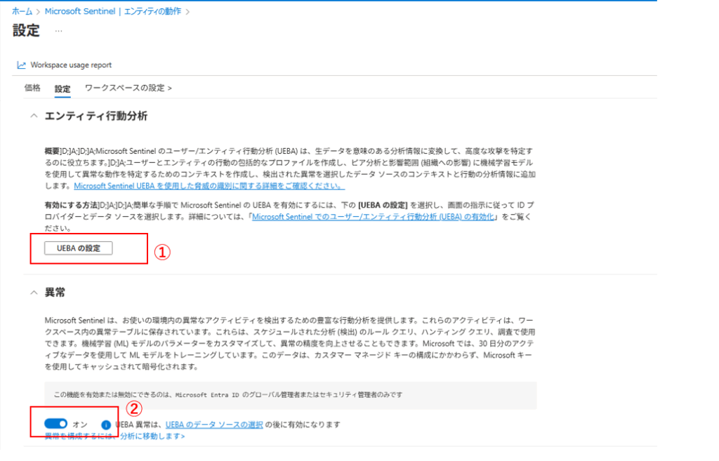 上述の①UEBAの設定と②異常を「オン」に設定の画面ですが、以下となります(設定箇所がわかりにくかったので、備忘のためメモ)