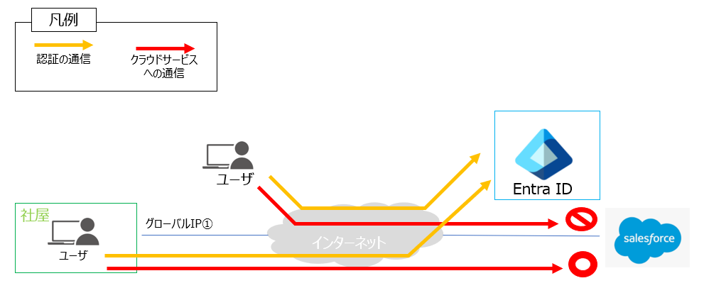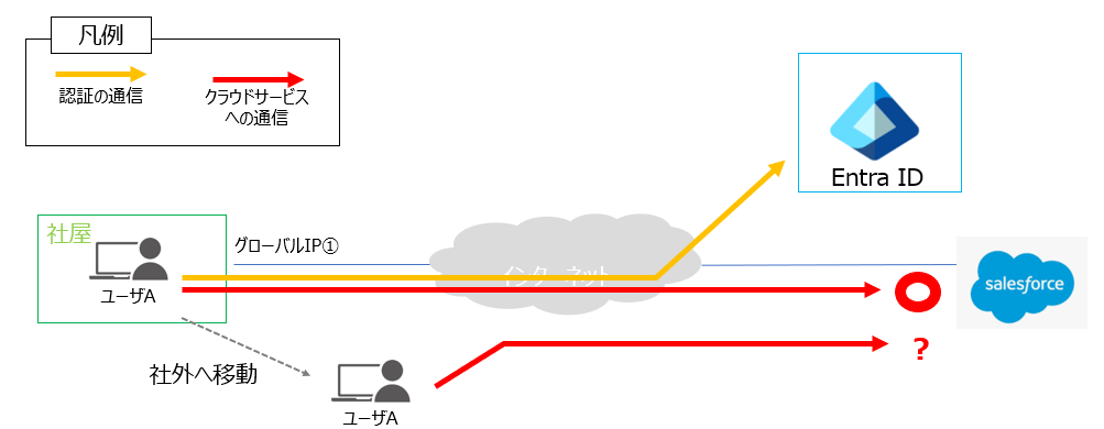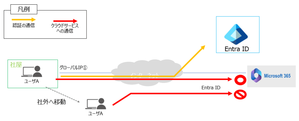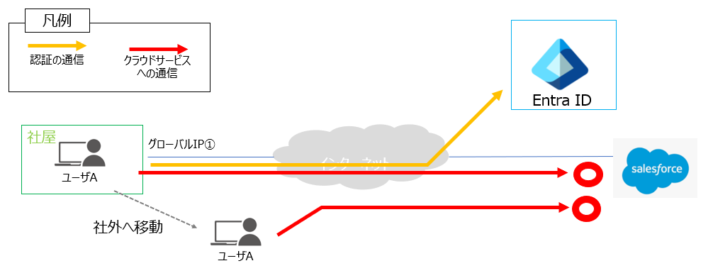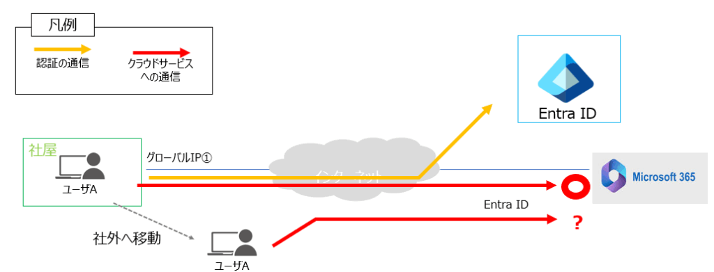 ・ユーザAが、グローバルIP①の配下からEntra IDでのに認証後に、社外へ移動