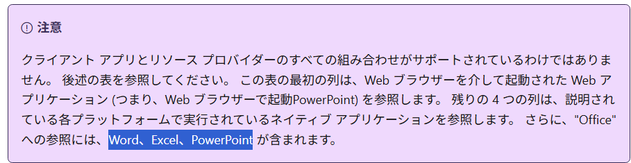 ここでは、Officeは、Word、Excel、PowerPoint を意味しています。以下の通り、ドキュメントにも明記されています。