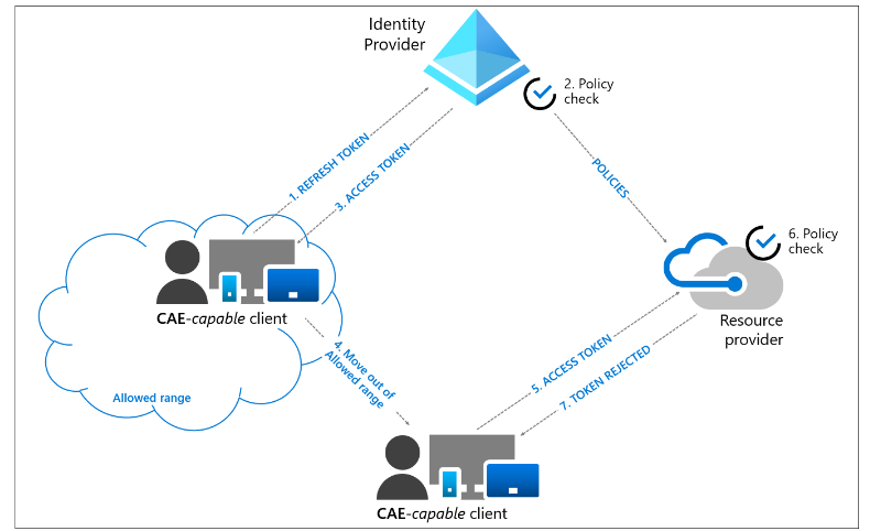 CAEに対応しているリソースプロバイダは、ユーザからアクセスがあるたびに、条件付きアクセスポリシーの情報を参照するためにEntra IDへアクセスしている訳ではありません。Entra IDの条件付きアクセスポリシーが、定期的にリソースプロバイダに同期され、リソースプロバイダはその情報を参照しています。