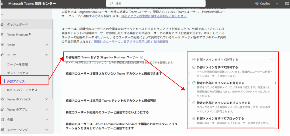 「外部アクセス」の設定において、外部ドメインをブロックする
