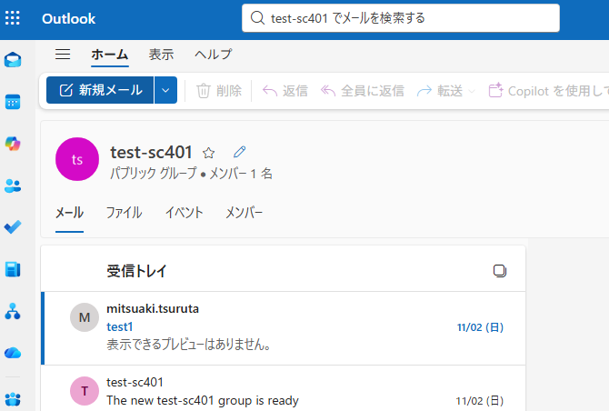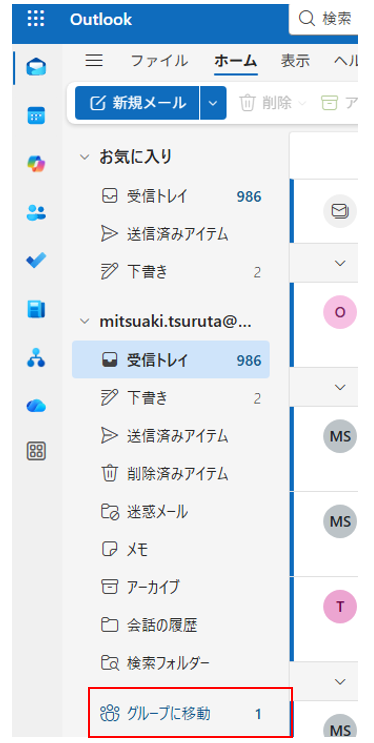 ユーザを、Microsoft 365 グループに所属させると、Outlook(以下はOutlook Webの例)上で、「グループ」宛のメールが確認できるページへのリンクが表示されます(以下赤枠部分)