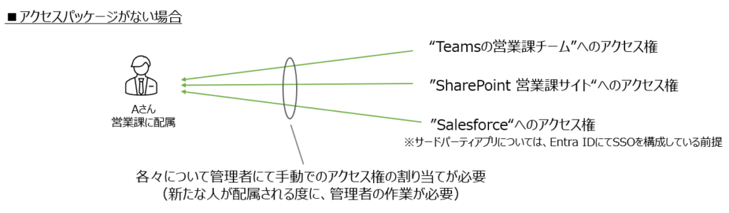 ・アクセス権付与の対象となるリソース(TeamsチームやSPOサイト等)が増えると、作業が大変(管理者の負担大きい)