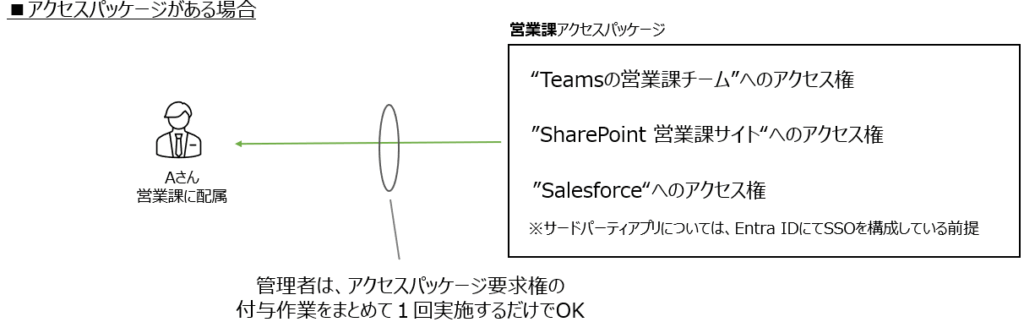 アクセスPKGは、M365各種アプリなどの複数のリソースへのアクセス権を「アクセスパッケージ」としてまとめ、ユーザーに一括で付与きる機能