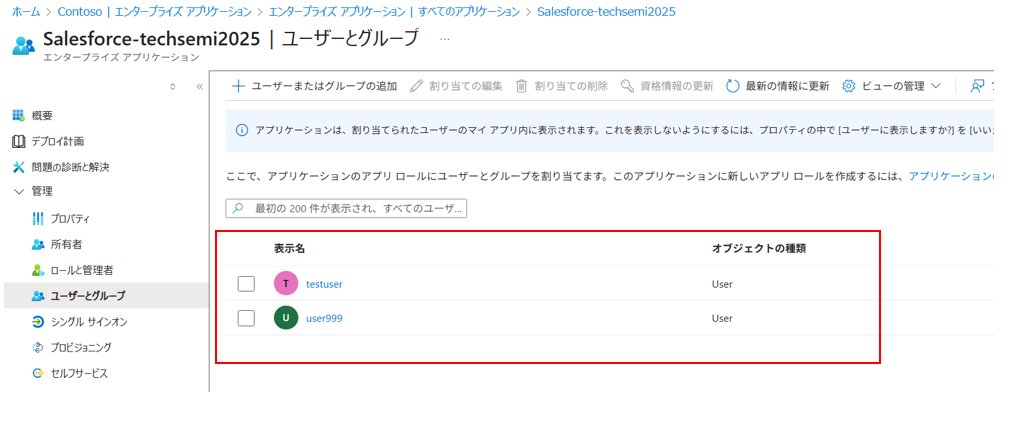 アプリケーションへのアクセス権を付与するには、Entra IDにおける”エンタープライズアプリケーション”の以下の画面にユーザを追加する必要があります。