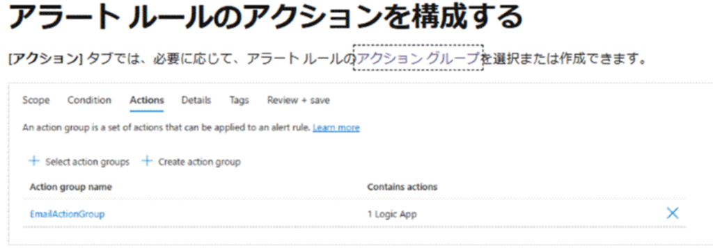 通知を行うために、メールなど通知するアクション グループを選択もしくは新規作成します。