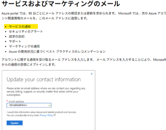 宛先がサブスクリプション管理者のみとなりますが、Azure アカウントに関しての請求、サービス、推奨量などに関連した重要な通知を受け取ることができます。