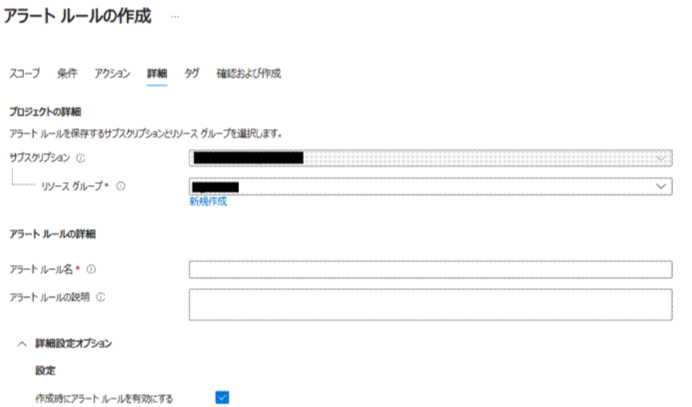 また、アラート ルールの作成が完了したら有効化されるように、詳細設定オプションの [作成時にアラート ルールを有効にする] を選択します