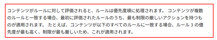 日本語的にわかりにくいところがありますが、「評価されたルールのうち、最も制限の厳しいアクションを持つものが適用されます」と理解しておけばよいとのことです(MSサポートに確認済み)