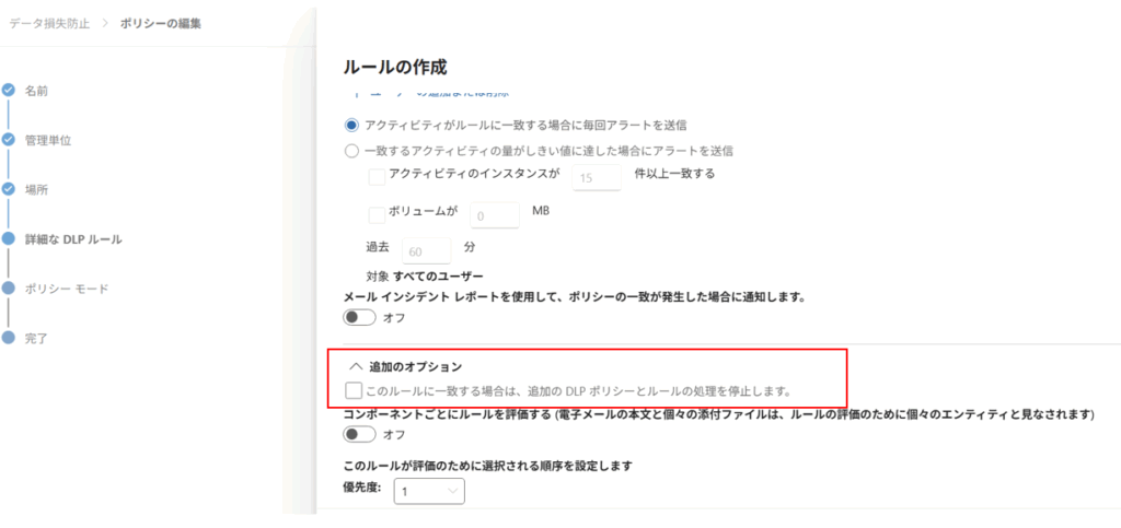 [このルールに一致する場合は、追加のDLPポリシーとルールの処理を停止します] の設定について