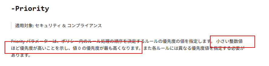 すべてのルールが評価され、結局その中で最も制限の厳しいアクションを持つものが適用されるのであれば、優先度の意味はないのではないか?と思う方もいるかもしれませんが、優先度は、同一の制限を有するルールが複数存在した場合に関係してきます。