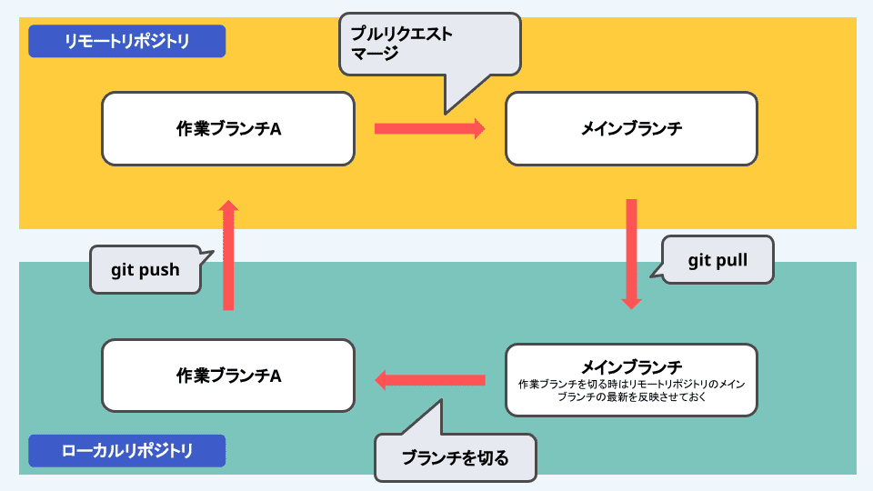 - 「ブランチを切る」とは、あるブランチから、別のブランチを作成すること(元のブランチをコピーして、別の名前を付けるイメージ)