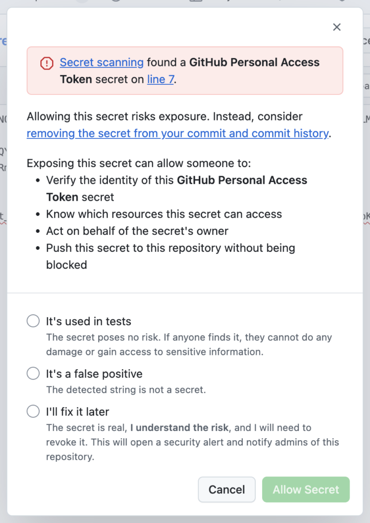 複数のパブリックリポジトリで作業をしているような場合で、そのパブリックリポジトリでプッシュ保護が有効でない場合、プッシュ操作によりシークレットがパブリックリポジトリにアップされてしまう可能性がある。