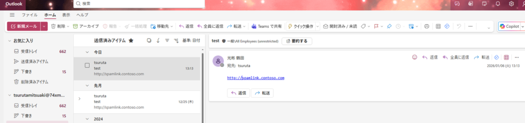 送信済みフォルダの内容です。こちらもURLは書き換わっていないように見えますが、右クリックで実際のURLを確認すると、https://apc01.safelinks.protection.outlook.com/~となっていました。