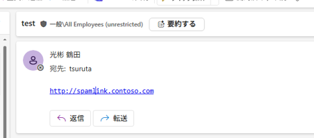 以下は、受信側のOutlook Webの画面です。一見、URLは書き換わっていないように見えますが、右クリックで実際のURLを確認すると、https://apc01.safelinks.protection.outlook.com/~となっていました。