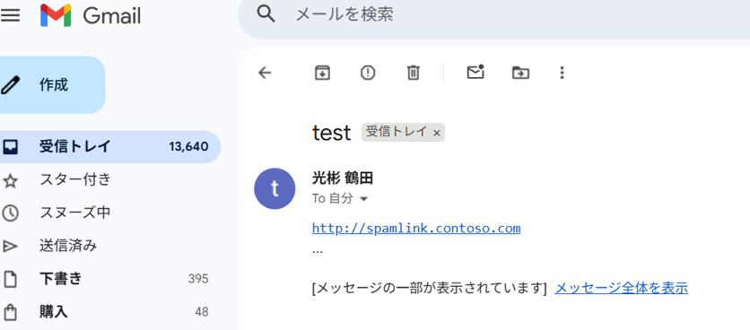 外部(gmail)から、安全なリンクポリシーの対象者に危険なURL(試験用)のメールを送付しました。
